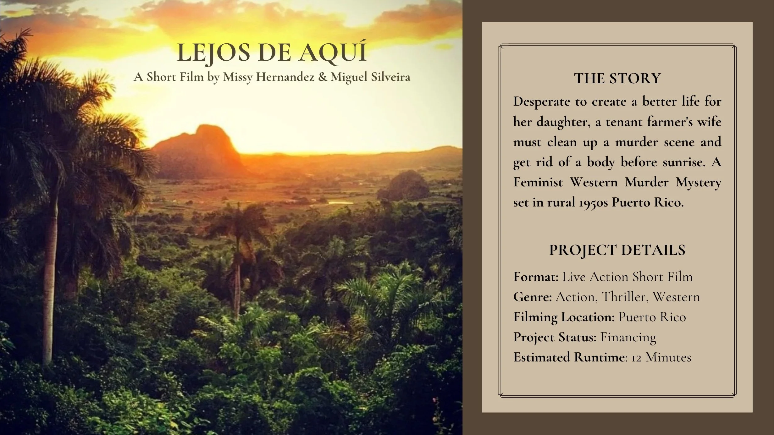 LUISA (30s), an earthy mother and tenant farmer, struggles to move the body of a lifeless man in the middle of the night. The story begins here and then jumps back to earlier that day. Luisa wakes up and starts her day at sunrise while her husband, CASIMIRO (40s), stumbles home drunk. Luisa goes about her day with a secret -- she and her daughter, ROSARIO (13), are running away to live on the mainland. Complications arise after Casimiro takes his daughter on a walk near the caves and an unexpected visit from the patrón, DAMIÁN (50s), brings unwelcome attention. The story unfolds between two timelines: the day leading up to a murder and what unfolds immediately after it -- slowly revealing the details of who was murdered, how, and why while Luisa works desperately to escape.
